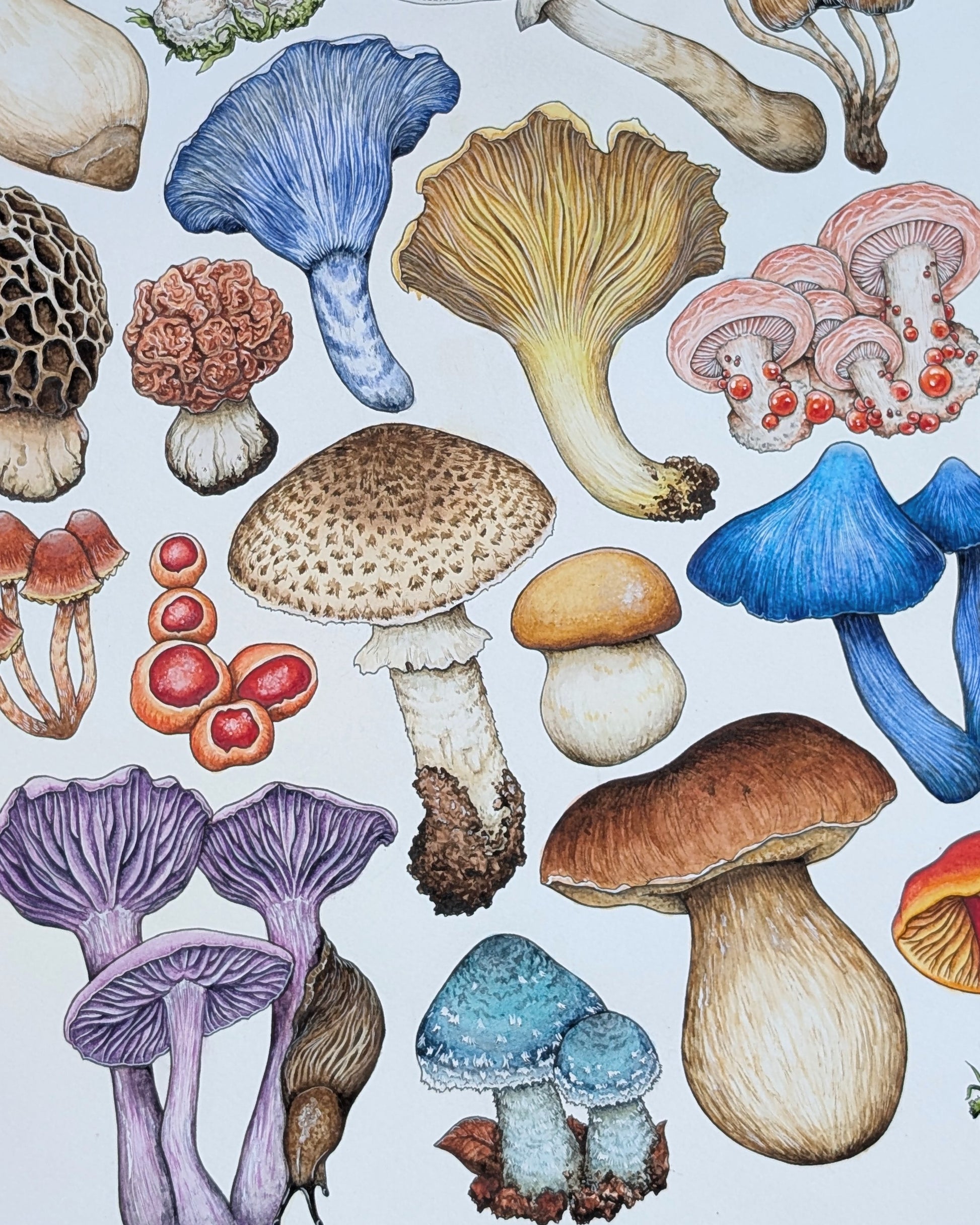 Revamp of my original 'Mushrooms'Β print π the same vibe as the previous design, but with updated watercolour illustrations including a range of unusual, colourful shrooms!! Perfect to brighten up any office or kitchen, including edible and non edible fungiΒ