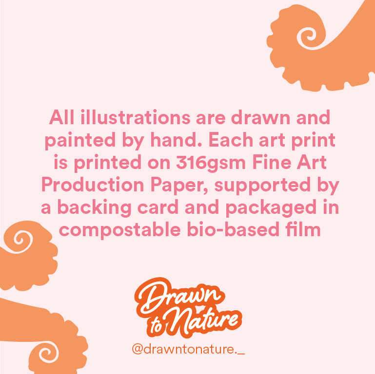 Printed to size on high quality, textured art paper. Each print is wrapped with care in waterproof cello envelopes with recycled backing card and in tissue paper to ensure safe travel in the post to you