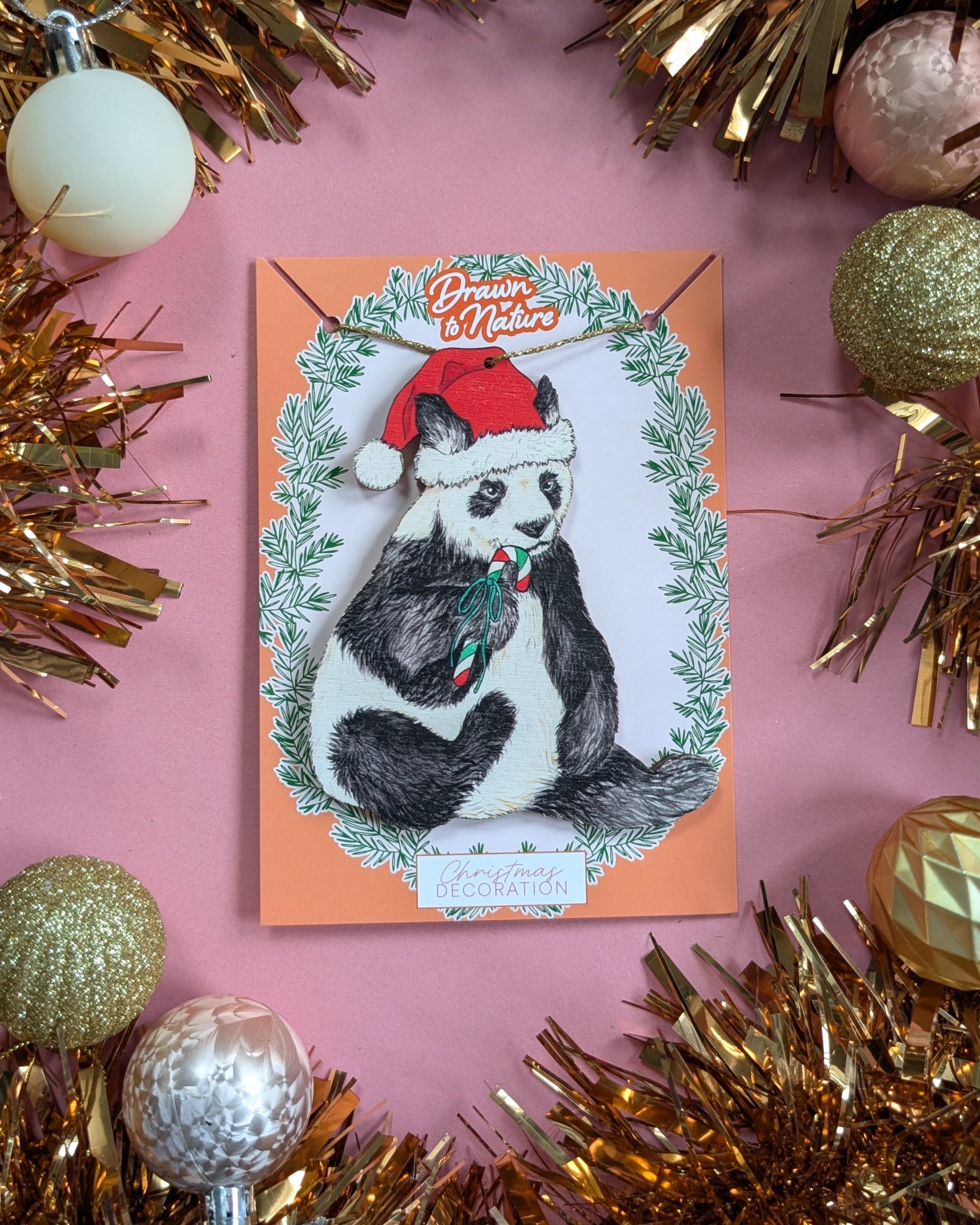 Cute wildlife addition to your tree this year! Featuring a beautifully detailed watercolour illustration of a Panda wearing a Santa hat, enjoying a candy cane, printed onto durable poplar plywood! This unique decoration brings a festive and eco-friendly addition to your home decor ✨