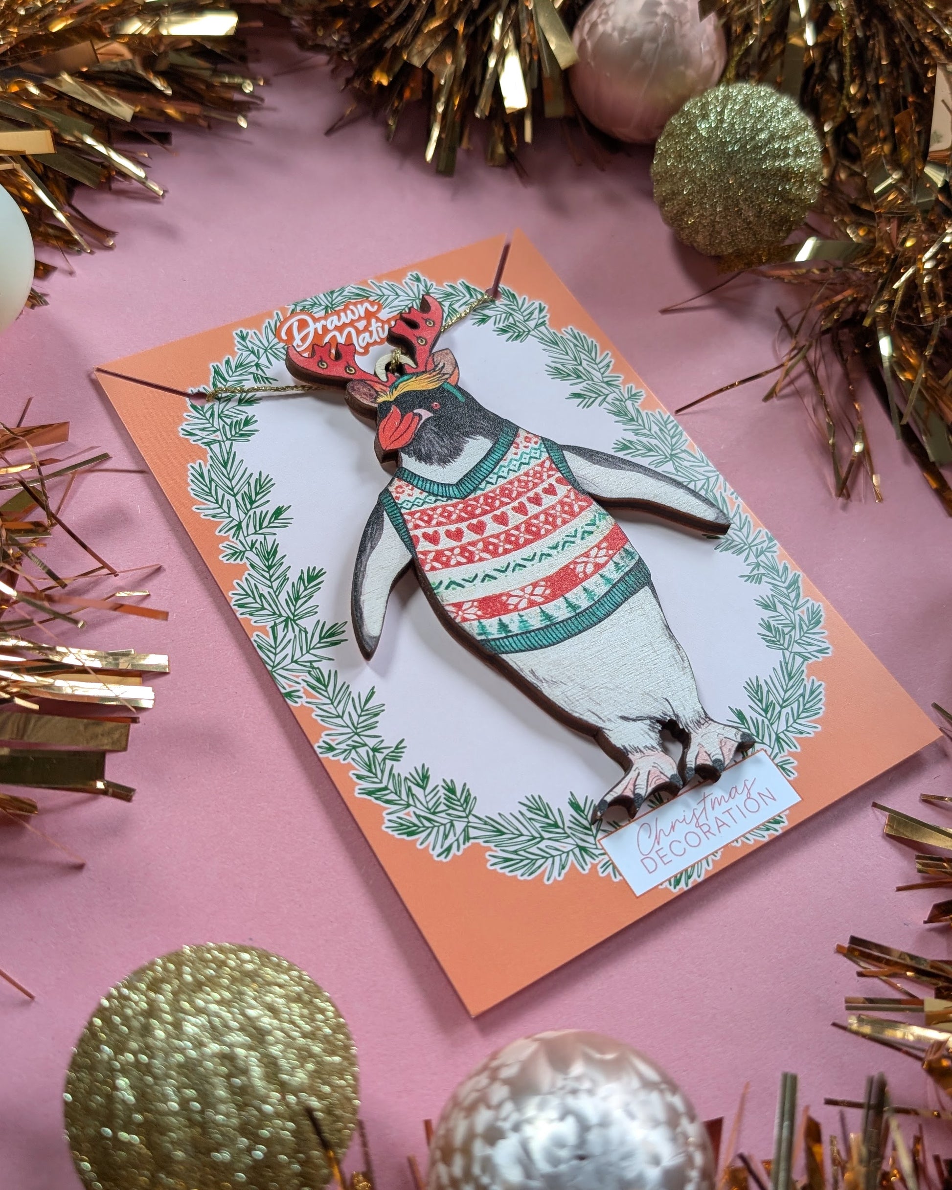 Cute wildlife addition to the Christmas tree this year! Featuring a beautifully detailed watercolour illustration of a Penguin, wearing Reindeer antlers and his favourite Christmassysweater vest, printed onto durable poplar plywood! This alt decoration brings a festive and eco-friendly addition to your home decor, a unique xmas keepsake â¨