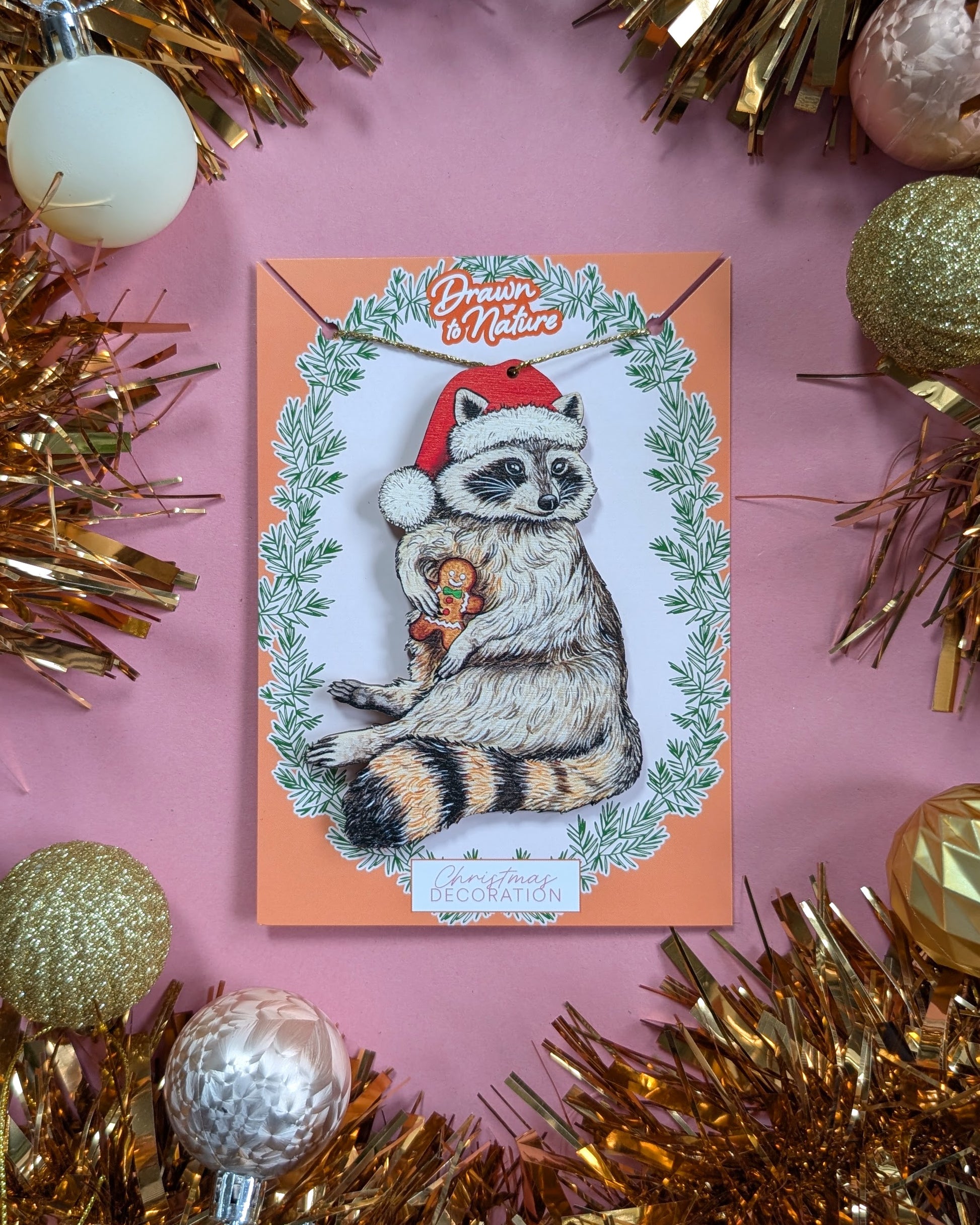 Cute wildlife addition to your tree this year! Featuring a beautifully detailed watercolour illustration of a Raccoon wearing a Santa hat, enjoying a cheeky gingerbread man, printed onto durable poplar plywood! This unique, alt decoration brings a festive and eco-friendly addition to your home decor ✨